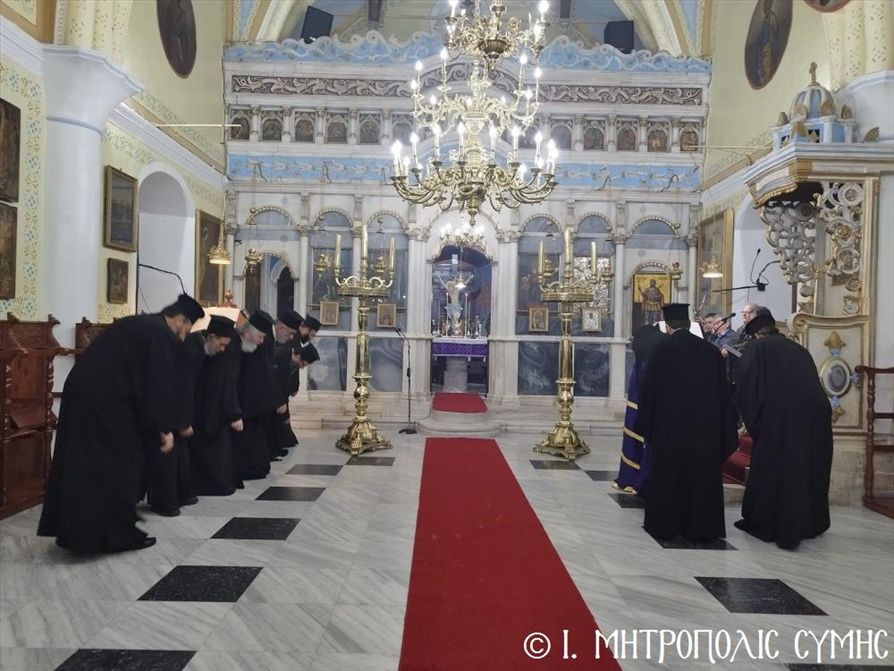 Σήμερα, Κυριακή τῆς Τυρινῆς, 17η Μαρτίου 2024 καί ὥρα 6η ἀπογευματινή ἐτελέσθη, χοροστατοῦντος τοῦ Σεβ. Ποιμενάρχου μας κ. Χρυσοστόμου καί συμπροσευχομένων τῶν Κληρικῶν τῆς Νήσου μας, ὁ Α΄ Κατανυκτικός Ἑσπερινός τῆς Ἁγίας καί Μεγάλης Τεσσαρακοστῆς, ὁ ἑπονομαζόμενος τῆς «Συγγνώμης», εἰς τόν Ἱερόν Μητροπολιτικόν Ναόν τοῦ Τιμίου Προδρόμου Σύμης. Τό ἱερόν Ἀναλόγιον διακόνησαν οἱ Ἱεροψάλτες κ.κ. Δημοσθένης Γιανναρᾶς, Σταῦρος Πίλιουρας, Χαράλαμπος Κατσιμπρής καί Ἐλευθέριος Ξηράκης, ἐνῶ συμμετεῖχε ἀρκετός κόσμος.