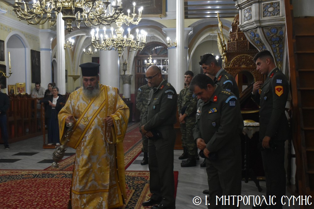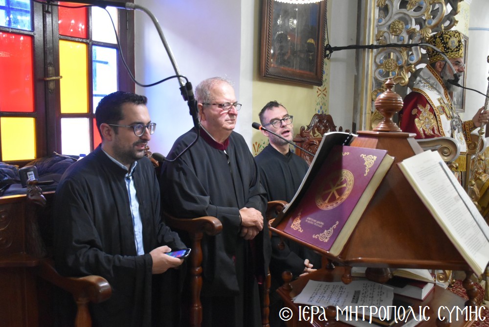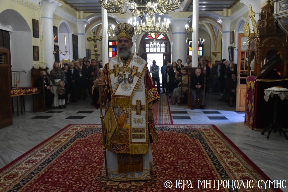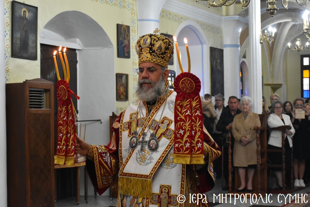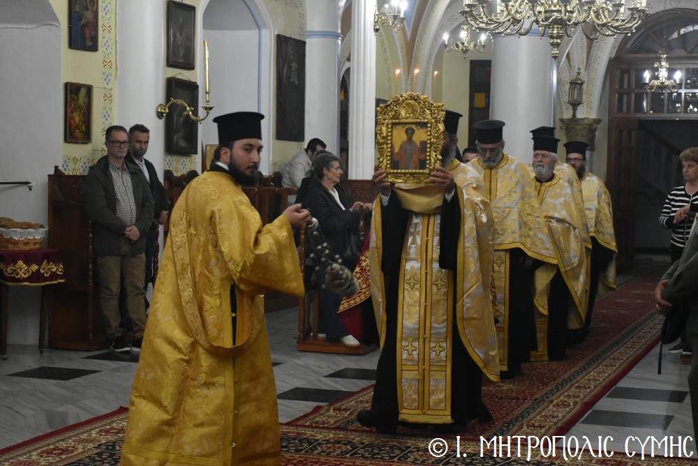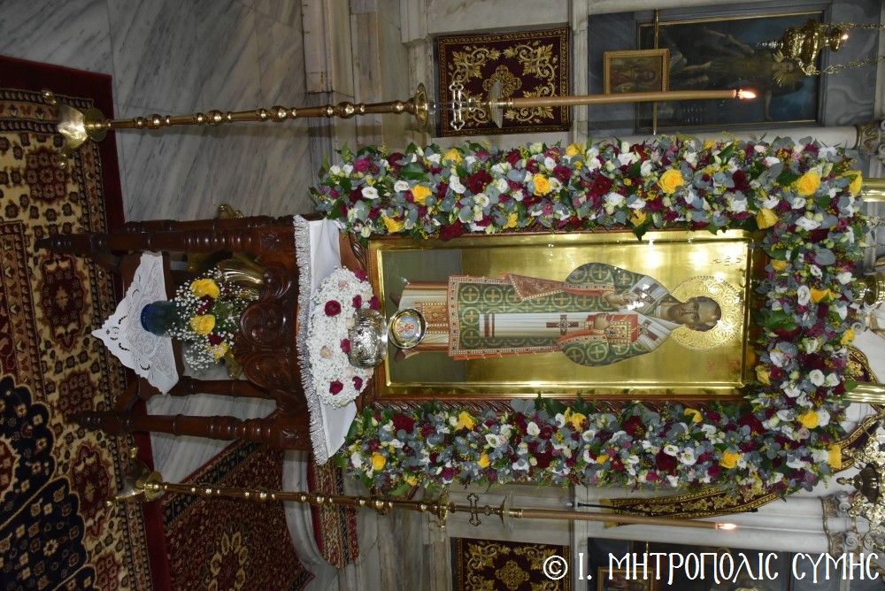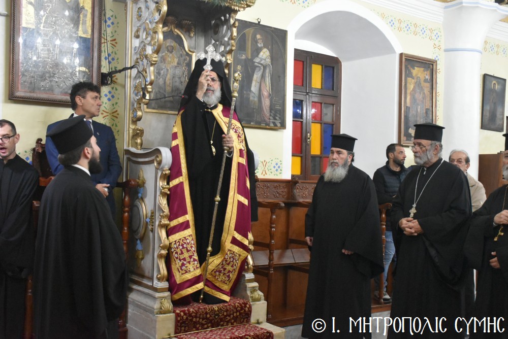 Τό ἑσπέρας τῆς Τετάρτης 12ης Νοεμβρίου, ἐτελέσθη ὁ Μέγας Πανηγυρικός Ἑσπερινός, χοροστατοῦντος τοῦ Σεβασμιωτάτου, πλαισιουμένου ὑπό τοῦ Ἱεροῦ κλήρου τῆς Νήσου μας. Τά δέ ἀναλόγια διακόνησαν γλυκυφθόγγως δεξιά, ὁ Πρωτοψάλτης τοῦ Μητροπολιτικοῦ Ναοῦ κ. Δημοσθένης Γιανναρᾶς μετά τοῦ υἱοῦ του κ. Μερκουρίου καί ὁ κ. Εὐάγγελος Λαγός καί ἀριστερά ὁ Ἱεροψάλτης κ. Ἐλευθέριος Ξηράκης καί ὁ κ. Ἀγαπητός Μιχελλής. Μεταξύ τῶν συμμετεχόντων πιστῶν, παρέστησαν ὁ Δήμαρχος Σύμης κ. Ἐλευθέριος Παπακαλοδούκας μετά τοῦ Ἀντιδημάρχου κ. Νικήτα Γρύλλη, ὁ Στρατιωτικός Διοικητής Δ.Α.Ν. Σύμης, Συνταγματάρχης κ. Χαράλαμπος Κατηφόρης, ὁ Διοικητής τοῦ 549 Τ.Ε. Σύμης Ἀντισυνταγματάρχης κ. Εὐάγγελος Καρσιώτης καί ἄλλοι ἐκπρόσωποι τοπικῶν Φορέων καί Συλλόγων. Μετά τήν ἀπόλυση, οἱ συμμετέχοντες κληρικοί καί λαϊκοί ἀνέβηκαν στό παρακείμενο Ἀρχονταρίκι τοῦ Ναοῦ, ὅπου ἕκαστος εὐχήθη στόν ἑορτάζοντα Μητροπολίτη μας καί ἐδέχθη τά ἑόρτια κεράσματα.