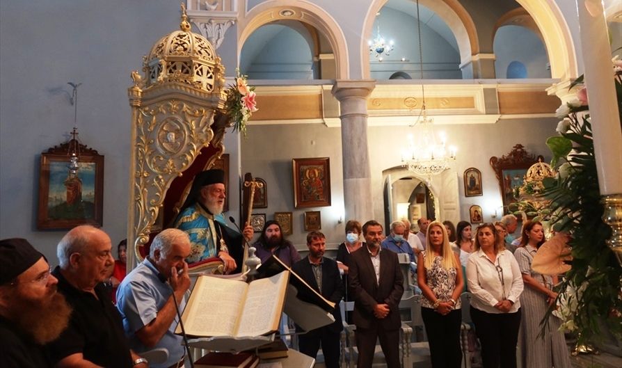 Κάλεσε, τέλος, τους παρισταμένους και τους θεατές του τοπικού Τηλεοπτικού Σταθμού “SYROS TV1”, που αναμετέδιδε απ’ ευθείας την Ακολουθία, να μη λησμονήσουν ποτέ ότι ο Ναός της του Θεού Σοφίας είναι το πνευματικό Αρτοφόριο, που διαφυλάσσει τις μνήμες και της παραδόσεις της Ορθοδοξίας και του Ελληνισμού, και να παραδώσουν το χρέος αυτό προς τα παιδιά τους.