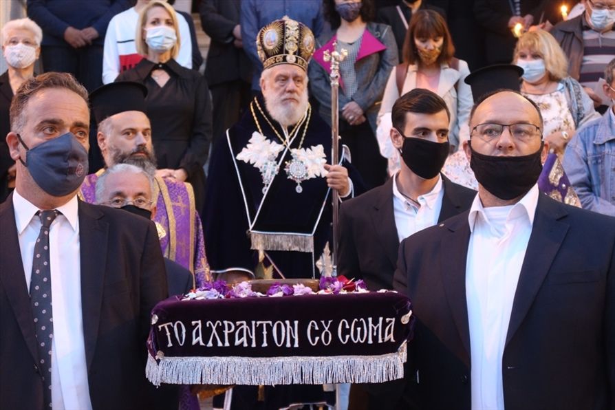 Ακολούθησε η περιφορά του Επιταφίου πέριξ του Ιερού Ναού, κατά τις εντολές της Ιεράς Συνόδου.