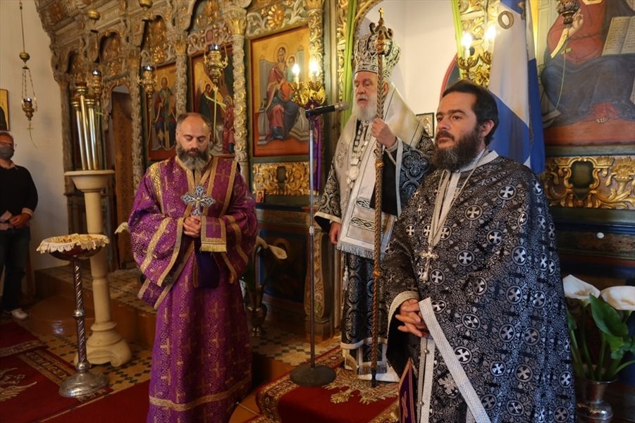 Ευχαρίστησε και συνεχάρη τον Εφημέριο του Ναού, Πρωτοπρ. Παναγιώτη Μανιδάκη, για την με ιεραποστολικό ζήλο διακονία των Ενοριών της απομακρυσμένης αυτής περιοχής και ιδιαίτερα την ιεροψάλτρια κα Μαρία Τριδήμα, η οποία, ως καλή συνέκδημος, τον ακολουθεί στη λειτουργική διακονία των ολιγάνθρωπων Ενοριών της περιοχής, διακοσμούσα το αναλόγιό τους, και τέλος ευχήθηκε σε όλους για το Άγιο Πάσχα.