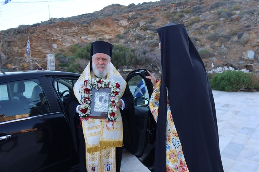 Ευχαρίστησε τον Αρχιερατικό Επίτροπο Τήνου, Πρωτόπρ. Γεώργιος Φανερός, για την πρωτοβουλία και τη μεριμνά του να διακομισθεί στη Σύρο η Εικόνα της Παναγίας «Κυρά-Ξένης», που τόσο ευλαβούνται οι κάτοικοι του Πύργου, του Πανόρμου και της Τήνου ευρύτερα, και κατέληξε λέγων ότι «η άφιξη κσι υποδοχή της Εικόνας της Παναγίας «Κυρά-Ξένης», η επέτειος της Ευρέσεως της Εικόνας του Αγίου Δημητρίου και ο ιαματικός λόγος του Κυρίου προς τον μη έχοντα άνθρωπον να τον βοηθήσει παραλυτικό της αυριανής Ευαγγελικής περικοπής θα ζυμώσουν το πρόσφορο, που θα τελεστεί η Λειτουργία και αφιερωθεί αύριο στην Ανάσταση του Κυρίου».