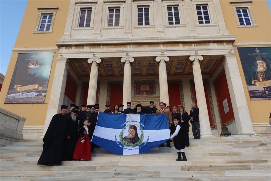 Με την παρουσία του Ιερού Κλήρου της Σύρου, του κ. Εισαγγελέως Εφετών Αιγαίου, της Προέδρου και των Μελών του ΔΣ του Συλλόγου Μικρασιατών Σύρου και της εντεταλμένης επί θεμάτων Παιδείας Δημοτικής Συμβούλου κας Ειρήνης Δράκου, εκπροσωπούσης τον απουσιάζοντα εκ Σύρου Μικρασιάτη Δήμαρχο Σύρου-Ερμούπολης κ. Νικόλαο Λειβαδάρα, και ενώ οι παριστάμενοι έψαλλαν, σε κλίμα συγκίνησης, τον Εθνικό Ύμνο, ο Σεβασμιώτατος κ. Δωρόθεος Β΄ ανήρτησε απόψε στον κεντρικό ιστό του Καθεδρικού Ναού του Αγίου Νικολάου Ερμουπόλεως τη Σημαία Μνήμης για την Επέτειο των 100 ετὠν από τη Μικρασιατική Καταστροφή, την οποία φιλοτέχνησε η Ιερά Μητρόπολη και η οποία θα κυματίζει καθ' όλη τη διάρκεια του επετειακού έτους 2022.