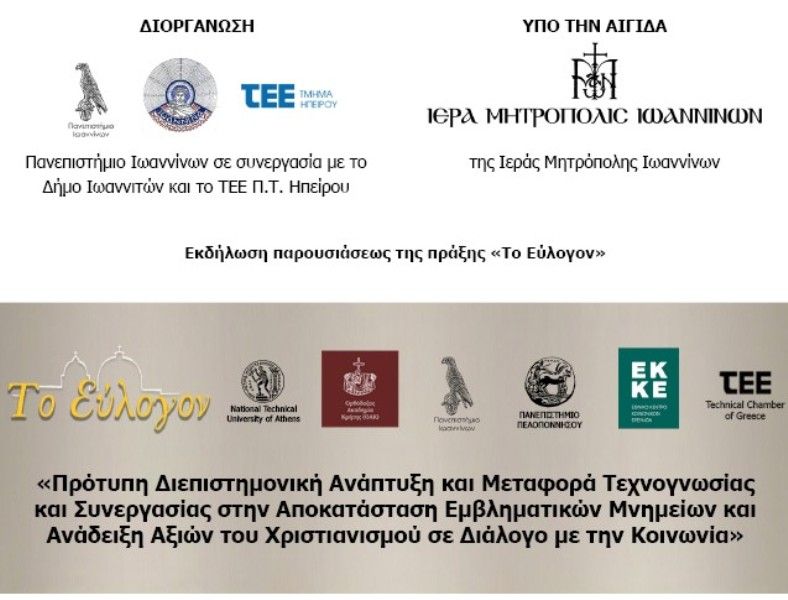 Από την Ιερά Μητρόπολη Ιωαννίνων γίνεται γνωστό στο πλήρωμα της τοπικής Εκκλησίας ότι την Κυριακή, 1η Φεβρουαρίου και ώρα 6.30΄ μ.μ. θα λάβει χώρα στον Πολιτιστικό Πολυχώρο «Δ. Χατζής» του Δήμου Ιωαννιτών ημερίδα για την παρουσίαση της πράξης «Το Εύλογον», που τελεί υπό την αιγίδα της Ιεράς Μητροπόλεως Ιωαννίνων, με τίτλο Πρότυπη Διεπιστημονική Ανάπτυξη και Μεταφορά Τεχνογνωσίας και Συνεργασίας στην Αποκατάσταση Εμβληματικών Μνημείων και Ανάδειξη Αξιών του Χριστιανισμού σε Διάλογο με την Κοινωνία, σύμφωνα με το συνημμένο πρόγραμμα και με σκοπό την ανάδειξη των αξιών του χριστιανισμού μέσα από την αποκατάσταση και την ανάδειξη των μνημείων, με την αξιοποίηση της καινοτομίας και της διεπιστημονικής συνεργασίας.
