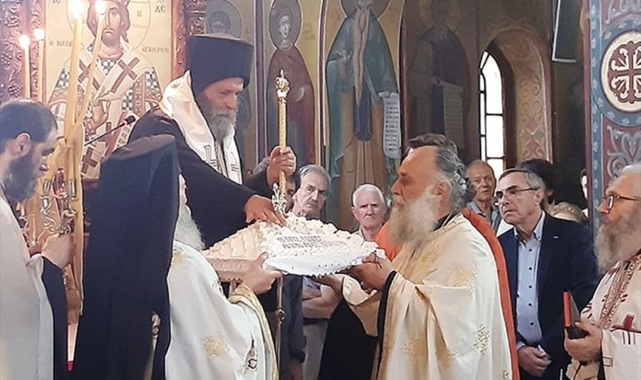 Τήν ἑπόμενη ἡμέρα, Παρασκευή 30 Ἰουνίου, τέλεσε τή Θεία Λειτουργία στόν παραπάνω πανηγυρίζοντα Ἱερό Ναό, πλαισιούμενος ἀπό ἱερείς τῆς μητροπόλεώς μας.