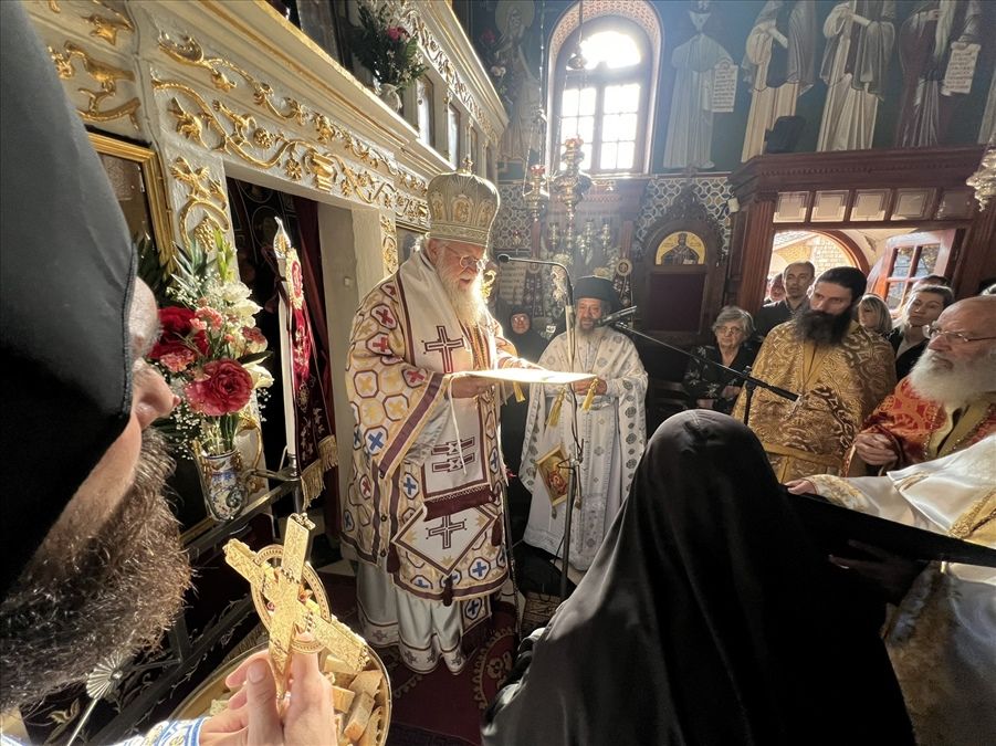 Κατά τη Θεία Λειτουργία, ο Σεβασμιώτατος έκηρε εις Μεγαλόσχημον Μοναχή μία εκ των αδελφών της Ιεράς Μονής, η οποία και έλαβε το όνομα Μακρίνα. Κατά την ομιλία του, απευθυνόμενος προς το πολυπληθές εκκλησίασμα, ο κ. Νεκτάριος αρχικά επεσήμανε ότι η σημερινή ημέρα είναι ιδιαιτέρως σπουδαία για την αδελφότητα καθώς η κουρά μία νέας μεγαλόσχημης μοναχής αποτελεί γεγονός μεγάλης χαράς. Η αδελφή Μακρίνα δοκιμάστηκε ιδιαίτερα στο μοναχικό βίο καθώς έζησε επί 22 έτη ως ρασοφορούσα μοναχή, με τον αρραβώνα δηλαδή του αγγελικού σχήματος. Έτσι, σήμερα, καταξιώνεται να λάβει το Μεγάλο και Αγγελικό Σχήμα. Εν συνεχεία, ο Σεβασμιώτατος απευθυνόμενος προς την αδελφή Μακρίνα επεσήμαινε ότι κατά την κουρά παρίστανται άγγελοι του Θεού οι οποίοι και κατέγραψαν την μοναχική ομολογία που μόλις έδωσε. Μάλιστα, τόνισε ότι στην ασκητική γραμματεία η κουρά αναφέρεται από τους Πατέρες ως το 8ο μυστήριο ως ένα δεύτερο βάπτισμα ενώ ο ίδιος ο Κύριός μας Ιησούς Χριστός παρίσταται νοερώς ως Εράσμιος Νυμφίος των μοναχών. Τούτο σημαίνει ότι η σχέση των μοναχών με το Θεό είναι ερωτική και καλλιεργείται με την προσευχή, την ησυχία και τη ζωή της ασκήσεως. Μάλιστα στους αναβαθμούς που ψάλλουμε αναφέρεται «Τοῖς ἐρημικοῖς ζωὴ μακαρία ἐστί, θεϊκῷ ἔρωτι πτερουμένοις». Ακριβώς αυτός ο θείος έρωτας είναι που καταλαμβάνει το κέντρο της ζωής του μοναχού. Έτσι, στις ευχές που προηγήθηκαν της κουράς παραινείται ο μοναχός να λατρεύει και να εργάζεται μόνον για το Χριστό και ο Κύριός μας να είναι προς το μοναχό «συγκοιταζόμενος, συνανιστάμενος, γλυκαίνων καὶ εὐφραίνων τὴν καρδία». Στα μέτρα της πνευματικής θεωρίας που καλείται να φθάσει ο μοναχός αυτό κατορθώνεται μέσα από την αδιάλειπτο προσευχή και τη Θεία Ευχαριστία. Παράλληλα η προσευχή καρποφορεί μέσα από την ησυχία και τη θυσιαστική αγάπη, την ταπείνωση και υπακοή προς την Πνευματική Μητέρα αλλά και ολόκληρη την αδελφότητα. Χωρίς την καλλιέργεια αυτών των αρετών ο μοναχός δε δύναται να αφήσει τον παλαιό άνθρωπο, και να αντικαταστήσει το ίδιον θέλημά με το θέλημα του Θεού.