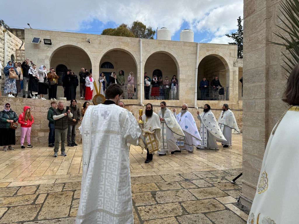 Τήν πρωΐαν τοῦ Σαββάτου τοῦ Λαζάρου, ἀνήμερα τῆς ἑορτῆς, ἐτελέσθη κατά τό προσκυνηματικόν τυπικόν θεία Λειτουργία ἐπί τοῦ τόπου τῆς Ἀναλήψεως τοῦ Σωτῆρος ἡμῶν Χριστοῦ, ἐντός τοῦ προσκυνήματος καί οὐχί εἰς τόν ὑπαίθριον χῶρον τόν ὑποκάτω τοῦ ἀντισκήνου, λόγῳ τοῦ ὑετοῦ, προεξάρχοντος τοῦ Σεβασμιωτάτου, συλλειτουργούντων αὐτοῦ τοῦ Γέροντος Καμαράση Ἀρχιμανδρίτου π. Νεκταρίου καί τοῦ Ἀρχιμανδρίτου π. Κλαυδίου, τῶν Ἀραβοφώνων Ἱερέων π. Νεκταρίου καί π. Γεωργίου καί τοῦ Ἱεροδιακόνου π. Δοσιθέου, ψάλλοντος τοῦ Πρωτοψάλτου τοῦ Ναοῦ τῆς Ἀναστάσεως διακόνου π. Εὐσταθίου μετά τῶν μαθητῶν τῆς Πατριαρχικῆς Σχολῆς Σιών ἑλληνιστί καί τῆς χορῳδίας τοῦ Καθεδρικοῦ Ναοῦ τοῦ Ἁγίου Ἰακώβου τοῦ Ἀδελφοθέου ἀραβιστί καί μετεχόντων ὀλίγων ἐντοπίων πιστῶν καί προσκυνητῶν.