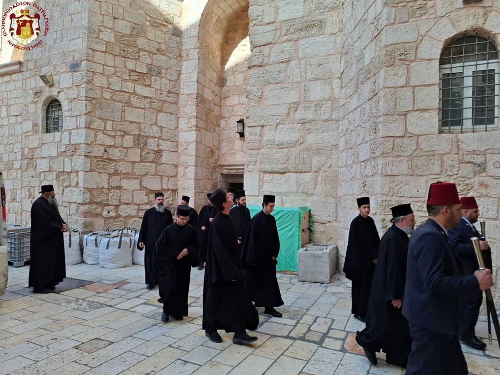 Διά τήν ἑορτήν ταύτην ἐτελέσθη θεία Λειτουργία τήν πρωΐαν εἰς τόν Πανίερον Ναόν τῆς Ἀναστάσεως, προεξάρχοντος τοῦ Σεβασμιωτάτου Ἀρχιεπισκόπου Λύδδης κ. Δημητρίου, συλλειτουργούντων αὐτῷ Ἁγιοταφιτῶν Ἱερομονάχων, ἐξ ὧν οἱ νεοχειροτονηθέντες Πρεσβύτεροι π. Συμεών καί π. Δοσίθεος καί ὁ Ἱεροδιάκονος π. Πρόδρομος, ψάλλοντος τοῦ Πρωτοψάλτου διακόνου π. Εὐσταθίου μετά τῶν μαθητῶν τῆς Πατριαρχικῆς Σχολῆς Σιών καί προσευχομένων Ἱεροσολυμιτῶν πιστῶν καί προσκυνητῶν.