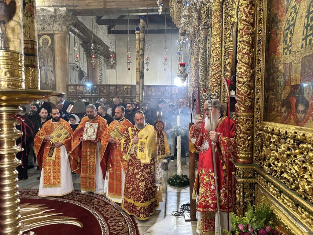 Εἰς τό Ἅγιον Σπήλαιον μετά τούς Ἀναβαθμούς ἀνεγνώσθη τό Εὐαγγέλιον τῆς Γεννήσεως: «ἐξῆλθε δόγμα παρά Καίσαρος Αὐγούστου ἀπογράφεσθαι πᾶσαν τήν Οικουμένην…» ἐκ τοῦ κατά Λουκᾶν Ἁγίου Εὐαγγελίου ἀραβιστί καί ἑλληνιστί καί ἐξεφωνήθη τό Χριστουγεννιάτικον Μήνυμα τοῦ Μακαριωτάτου ὑπό τοῦ Γέροντος Ἀρχιγραμματέως Σεβασμιωτάτου Ἀρχιεπισκόπου Κωνσταντίνης κ. Ἀριστάρχου εἰς τήν ἑλληνικήν καί ὑπό τοῦ Πρεσβυτέρου π. Ἤσσα Μοῦσλεχ εἰς τήν ἀραβικήν.