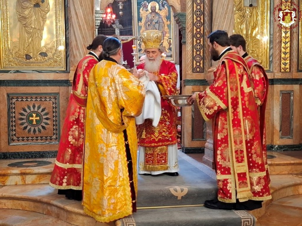 Τήν κυριώνυμον ἡμέραν τῆς ἑορτῆς ἐτελέσθη θεία Λειτουργία εἰς τό Καθολικόν τοῦ Πανιέρου Ναοῦ τῆς Ἀναστάσεως, προεξάρχοντος τοῦ Μακαριωτάτου Πατρός ἡμῶν καί Πατριάρχου Ἱεροσολύμων κ.κ. Θεοφίλου, συλλειτουργούντων Αὐτῷ τῶν Σεβασμιωτάτων Ἀρχιερέων Μητροπολίτου Καπιτωλιάδος κ. Ἡσυχίου, τῶν Σεβασμιωτάτων Ἀρχιεπισκόπων Γεράσων κ. Θεοφάνους, Ἀβήλων κ. Δωροθέου, Σεβαστείας κ. Θεοδοσίου, Λύδδης κ. Δημητρίου, Καττάρων κ. Μακαρίου, Πέλλης κ. Φιλουμένου, Ἁγιοταφιτῶν Ἱερομονάχων, ὧν πρῶτος ὁ Γέρων Καμαράσης Ἀρχιμανδρίτης π. Νεκτάριος, Ἀραβοφώνων Πρεσβυτέρων, τῶν ἐκπροσώπων ἄλλων Ὀρθοδόξων Ἐκκλησιῶν, Πατριαρχείου Μόσχας Ἀρχιμανδρίτου π. Βασιανοῦ καί Πατριαρχείου Ρουμανίας Ἀρχιμανδρίτου π. Θεοφίλου, ψάλλοντος τοῦ Πρωτοψάλτου καί διακόνου π. Εὐσταθίου Τσουμάνη, παρουσίᾳ τοῦ Γενικοῦ Προξένου τῆς Ἑλλάδος κ. Δημητρίου Ἀγγελοσοπούλου καί μετέχοντος πλήθους πιστῶν καί προσκυνητῶν.