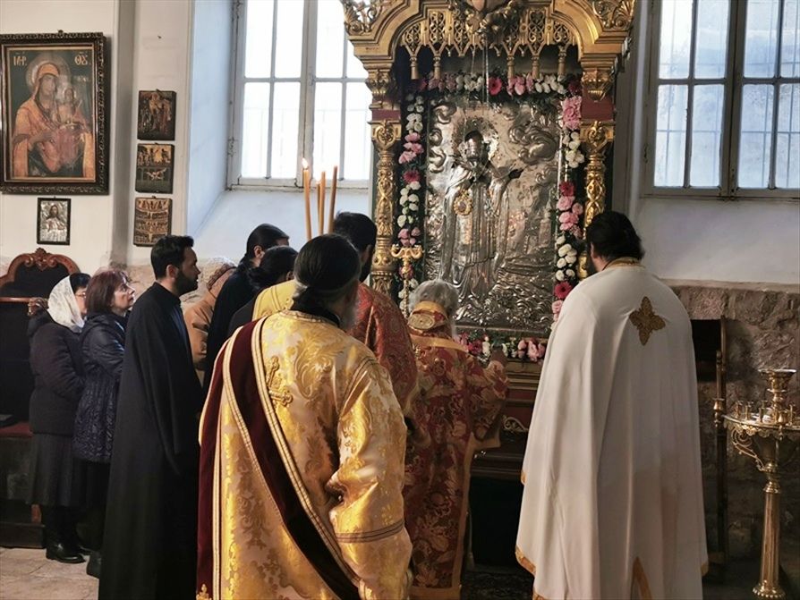 Πρός τιμήν αὐτῆς προεξῆρξεν εἰς τήν ὡς ἄνω Μονήν εἰς τόν Ἑσπερινόν ἀφ’ ἑσπέρας καί τήν θείαν Λειτουργίαν τήν πρωΐαν ὁ Σεβασμιώτατος Ἀρχιεπίσκοπος Θαβωρίου κ. Μεθόδιος, συλλειτουργούντων αὐτῷ τοῦ Δραγουμάνου Ἀρχιμανδρίτου π. Ματθαίου, τοῦ Πρεσβυτέρου π. Φάραχ, τοῦ Ἀρχιδιακόνου π. Μάρκου καί τοῦ Ἱεροδιακόνου π. Εὐλογίου, ψαλλόντων τοῦ Ἱεροδιακόνου π. Συμεών καί τοῦ κ. Βασιλείου Γκοτσοπούλου μετά τῶν μαθητῶν τῆς Πατριαρχικῆς Σχολῆς καί παρακολουθούντων μοναζουσῶν καί πιστῶν.