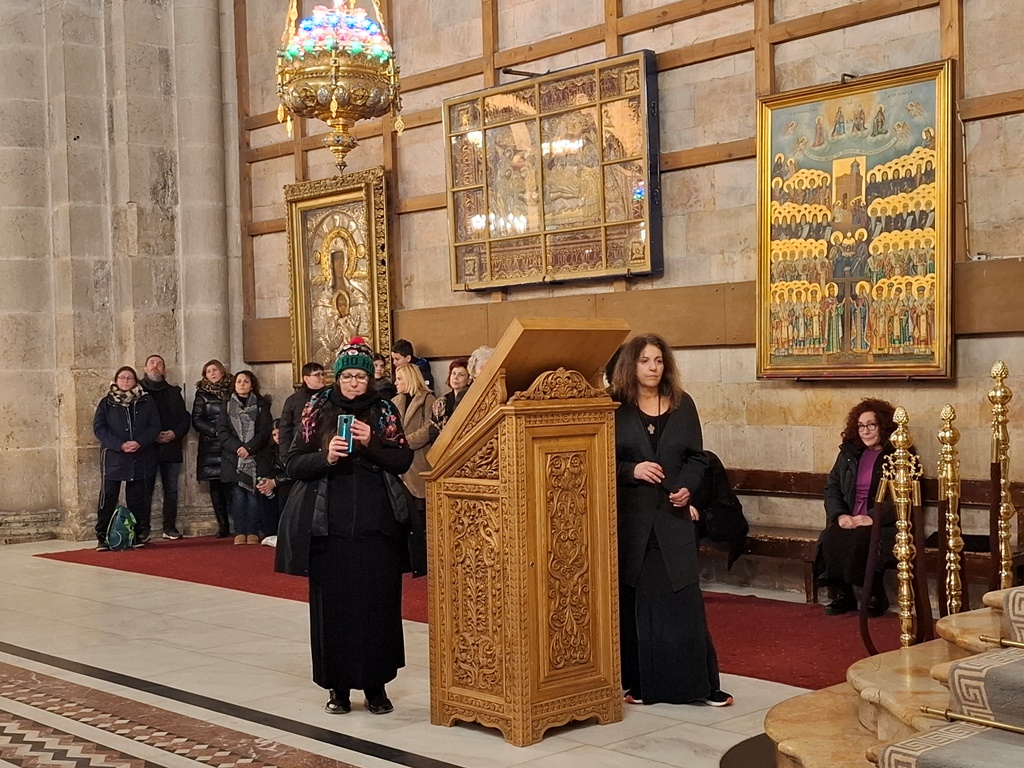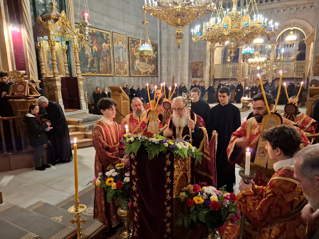 Τό ἑσπέρας τῆς Παρασκευῆς τῆς Α’ Ἑβδομάδος τῶν Νηστειῶν τῆς Μεγάλης Τεσσαρακοστῆς, 22αν Φεβρουαρίου / 7ης Μαρτίου 2025 εἰς τό Καθολικόν τοῦ Πανιέρου Ναοῦ τῆς Ἀναστάσεως καί εἰς τό πλαίσιον τῆς ἀκολουθίας τοῦ Μικροῦ Ἀποδείπνου, ἐψάλη ὁ κανών «Ἀνοίξω τό Στόμα μου» καί ἀνεγνώσθη ἠ Α’ Στάσις τῶν Χαιρετισμῶν τῆς Ὑπεραγίας Δεσποίνης ἡμῶν Θεοτόκου καί ἀειπαρθένου Μαρίας ὑπό τῆς Α.Θ.Μ. τοῦ Πατρός ἡμῶν καί Πατριάρχου Ἱεροσολύμων κ.κ. Θεοφίλου, τοῦ καί Προεξάρχοντος τῆς ὅλης Ἀκολουθίας, ψάλλοντος τοῦ Πρωτοψάλτου καί διακόνου π. Εὐσταθίου Τσουμάνου καί μετέχοντος εὐλαβοῦς ἐκκλησιάσματος ἐκ μοναχῶν, μοναζουσῶν καί λαϊκῶν, παρουσίᾳ τοῦ Γενικοῦ Προξένου τῆς Ἑλλάδος εἰς τά Ἱεροσόλυμα κ. Δημητρίου Ἀγγελοσοπούλου καί μελῶν τοῦ Ἑλληνικοῦ Γενικοῦ Προξενείου.