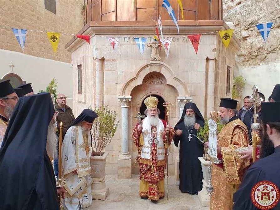 Τό Σάββατον, 5ην Δεκεμβρίου ἑωρτάσθη ἡ μνήμη τοῦ Ἁγίου Σάββα εἰς ὁλονύκτιον ἀγρυπνίαν, τῆς ὁποίας προεξῆρξεν ἡ Α.Θ.Μ. ὁ Πατήρ ἡμῶν καί Πατριάρχης Ἱεροσολύμων κ.κ. Θεόφιλος, συλλειτουργούντων Αὐτῷ τοῦ Σεβασμιωτάτου Ἀρχιεπισκόπου Κωνσταντίνης κ. Ἀριστάρχου καί τοῦ τοῦ Ἀρχιερέως τῆς σειρᾶς Σεβασμιωτάτου Μητροπολίτου Ἑλενουπόλεως κ. Ἰωακείμ, Ἁγιοταφιτῶν Ἱερομονάχων, ψαλλόντων τοῦ Ἱεροδιακόνου π. Συμεών καί τῶν βοηθῶν αὐτοῦ δεξιά ἑλληνιστί καί τοῦ Ἀρχιμανδρίτου π. Φιλοθέου ἀριστερά ἀραβιστί καί μετεχόντων Ὀρθοδόξων πιστῶν ἐκ Βηθλεέμ, Χωρίου τῶν Ποιμένων, Μπετζάλλας καί τοῦ βορείου Ἰσραήλ, τῇ τιμητικῇ παρουσίᾳ τοῦ Γενικοῦ Προξένου τῆς Ἑλλάδος εἰς τά Ἱεροσόλυμα κ. Εὐαγγέλου Βλιώρα.