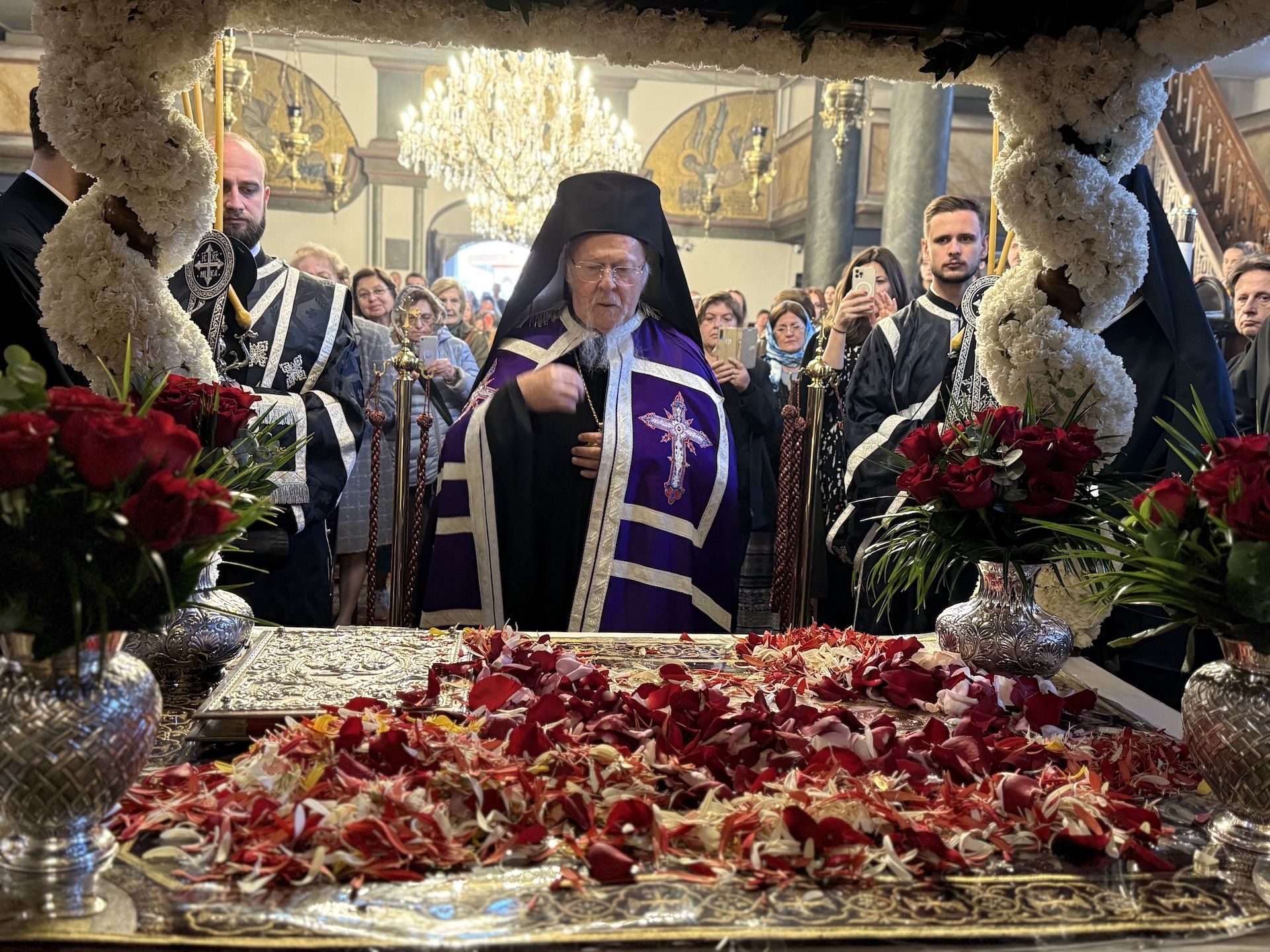 Το πρωί της Μ. Παρασκεύης, 18 Απριλίου 2025, στον Π. Πατριαρχικό Ναό, η Α.Θ. Παναγιότης ο Οικουμενικός Πατριάρχης κ.κ. Βαρθολομαίος χοροστάτησε στην Ακολουθία του Εσπερινού της Αποκαθηλώσεως, σε συγχοροστασία με τους Σεβ. Μητροπολίτες Φιλαδελφείας κ. Μελίτωνα, Μυριοφύτου και Περιστάσεως κ. Ειρηναίο, Μύρων κ. Χρυσόστομο, Ικονίου κ. Θεόληπτο, και Σελευκείας κ. Θεόδωρο.